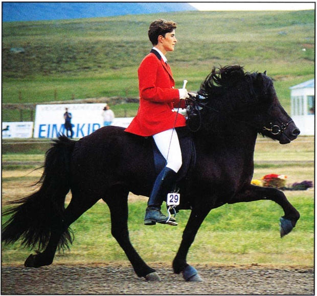 Álfadís gives offsprings of more than medium size with fairish head. The neck is soft with high shoulders. The back is wide and the croup is powerful but a bit coarse. Her offsprings have good proportions. Tendons in feet are strong and legs are dry. Straightness is dynamic but hoofs are admirable, main and tail is below medium. Álfadís gives great tolt, with good speed range, long strides and high movements. Trot is also excellent, with a lot of glide and long stride with high leg action. Three of the offsprings are amblers and they all callop nicely. Willingness is perpetually agile and light and the offsprings are splendid with high leg action.